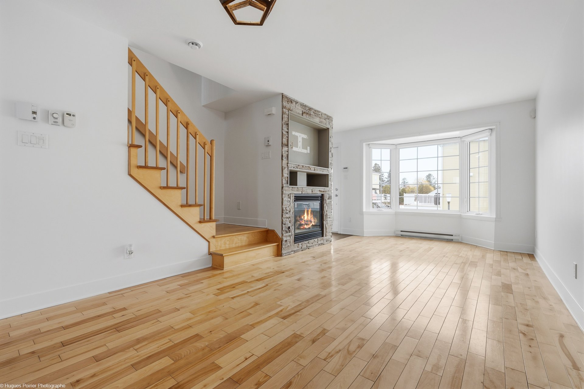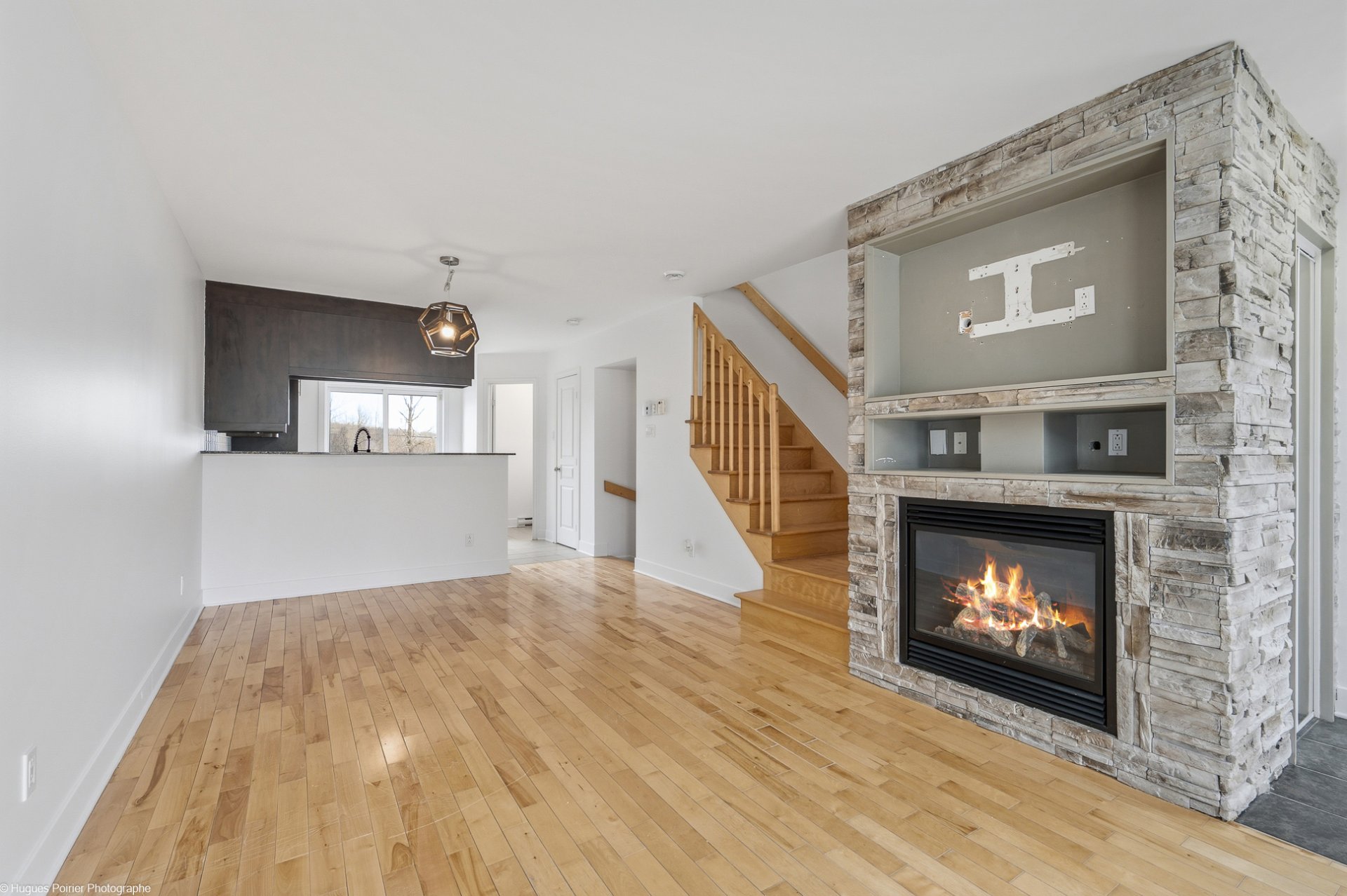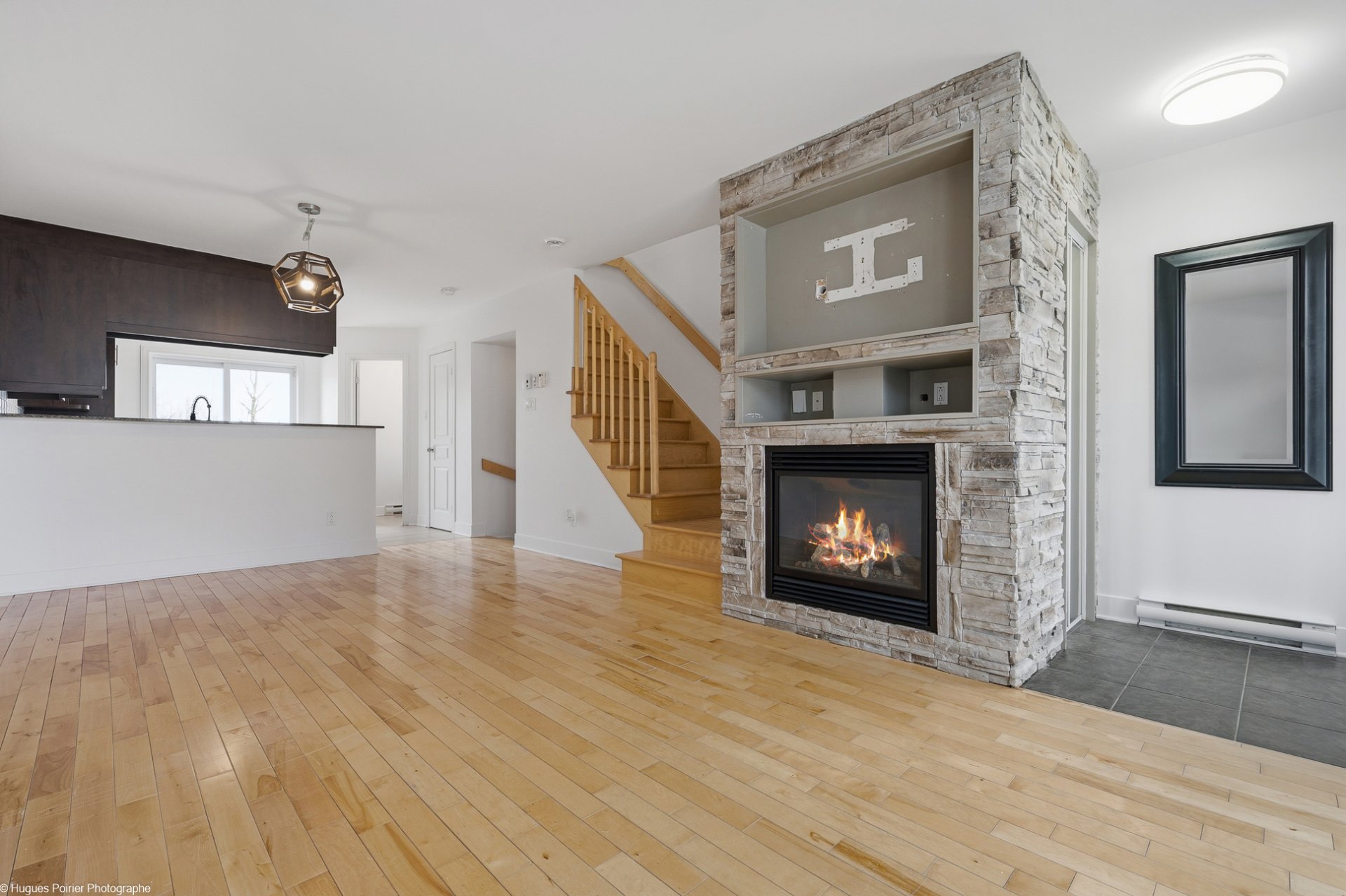 * Bright open concept living space with gas fireplace